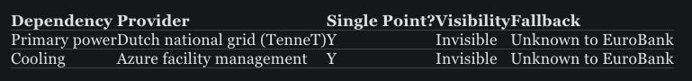 Why governance missed it: DORA Art. 11 requires incident detection, and EuroBank has it. What no framework requires is verifying that monitoring infrastructure is independent from the systems it watches. The architecture was designed for efficiency — same region, lower latency — not for the scenario where efficiency and resilience pull in opposite directions.