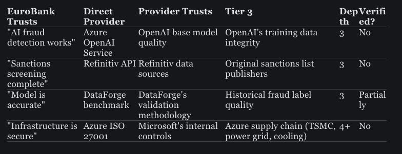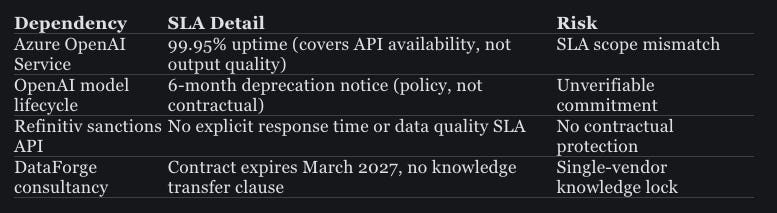 Unverified. EuroBank takes this at face value. What the SLA actually guarantees is that the API will respond — it says nothing about whether the response is correct, consistent with previous behaviour, or timely enough for real-time transaction processing. EuroBank’s continuity planning treats “uptime” and “working correctly” as the same thing. They aren’t.
