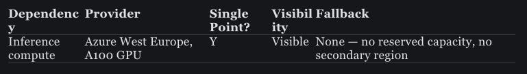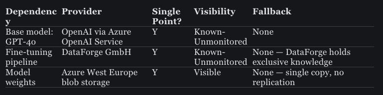 But the finding that matters most here is organisational, not technical. Ownership of this system is split three ways, and the split means nobody has a complete picture of the substrate. Compliance doesn’t know what GPU type runs inference. The CTO’s office doesn’t know what Refinitiv’s API depends on upstream. DataForge built the fine-tuning pipeline and the preprocessing logic, and that knowledge lives entirely with them — there’s no documentation, no handover, no backup.