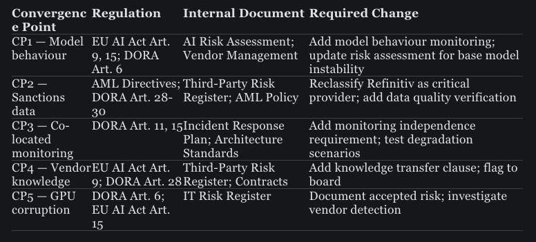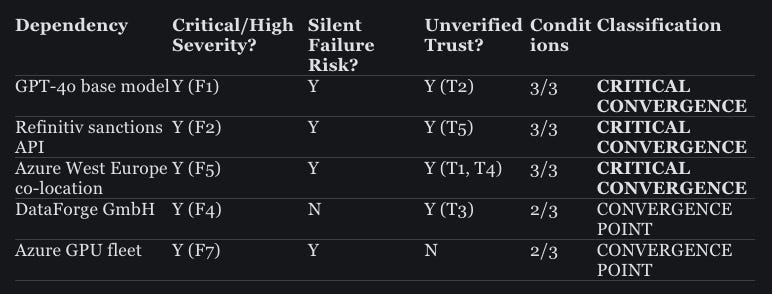 Three of the five are critical convergences — high-severity failure, silent failure risk, and unverified trust all present at the same time. Two carry criminal liability exposure (model behaviour change affecting sanctions screening, and sanctions data staleness). One means the system built to detect failure would go down with the system it’s supposed to be watching.