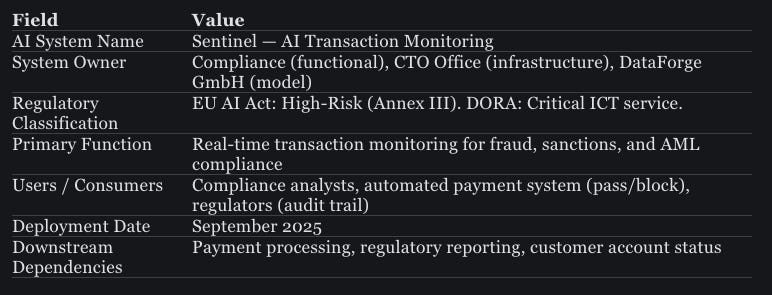 EuroBank is a mid-tier European bank, €45B in assets under management, headquartered in Frankfurt and regulated under DORA, the EU AI Act, and ECB supervisory requirements. In Q3 2025, the bank deployed “Sentinel” — an AI-powered transaction monitoring and fraud detection system that replaced a legacy rules-based engine.