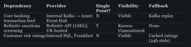 This one is at least detectable; Azure Service Health alerts would fire within minutes. The harder question is what happens next. The legacy rules engine was decommissioned. There’s no documented fallback for what EuroBank does when Sentinel is unavailable.